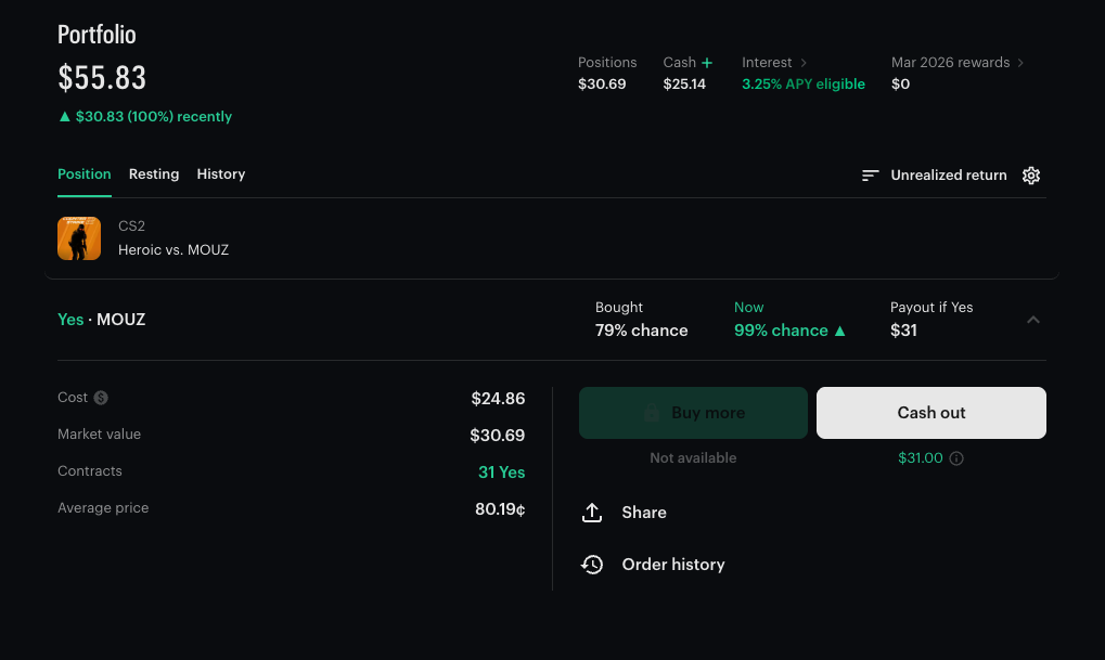 It turns out, Polymarket wasn't available in NY yet, but my friend has a referral code for Kalshi, so there I went. I couldn't find a trade that suited my idea, so I picked something that I had prior experience with: Counter Strike.